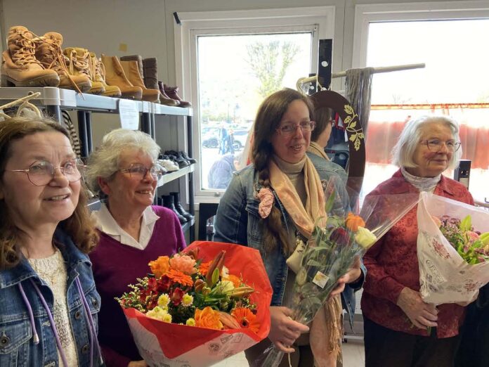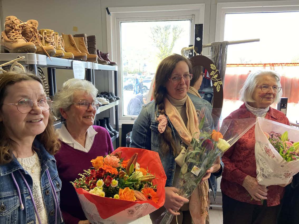 Ce mardi 14 avril, sur le parking du bassin du centre, dans l’enceinte du « Vestiaire », il y avait effervescence… En effet, en présence de l’adjointe à au maire de Honfleur, Catherine Pons cette dernière rendait hommage à deux bénévoles: Nicole Desa et Ginette Trouvé qui ont reçu chacune un bouquet de fleurs de la part de la nouvelle présidente de l’association Sophie Querou, venue de JSF, pour vingt ans de service et de présence.