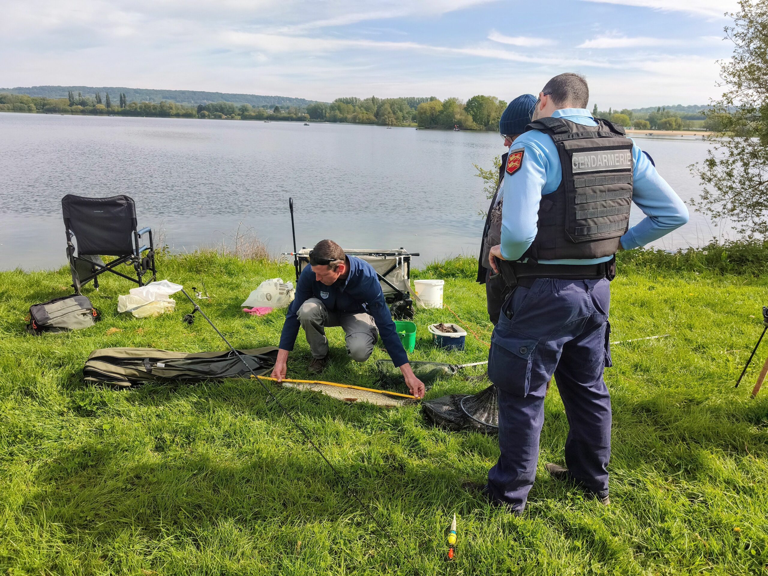 Ce samedi 25 avril 2026, à l’occasion de l’ouverture de la pêche du carnassier (brochets, perches, sandres…) un contrôle conjoint entre un garde-pêche particulier commissionné par la fédération de pêche du Calvados et des militaires de la gendarmerie de Pont l’Évêque (compagnie de gendarmerie de Deauville), dont le référent environnement, a été mené sur le plan d’eau de Terre d’Auge à Pont l’Evêque afin de procéder à des vérifications des titres de pêche et du poisson prélevé.
