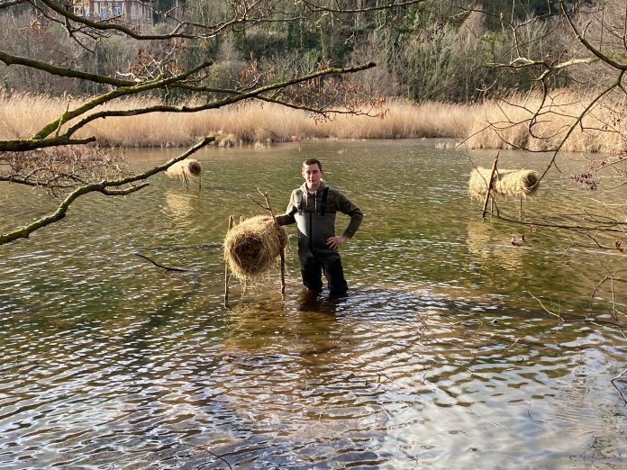 @Honfleurinfos : Thibaut Cauchois, installe des nids pour les canards.